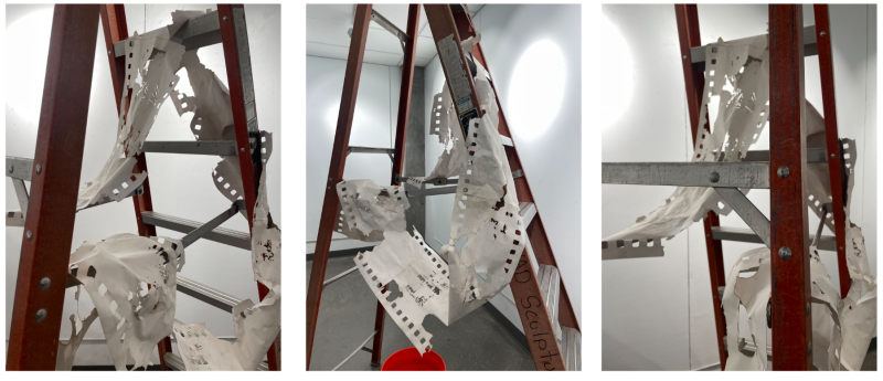 Unburned, 2024, lasered and etched paper, latter, bucket with water, ladder 120 x 12 in